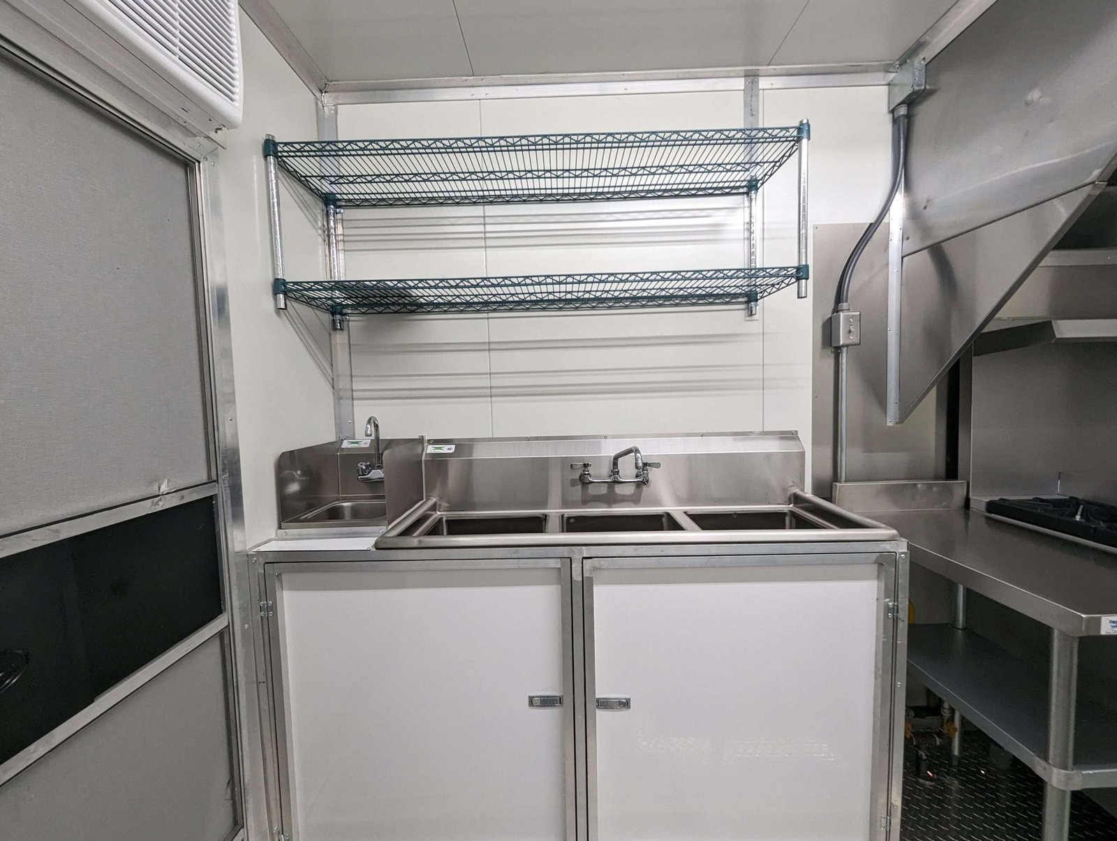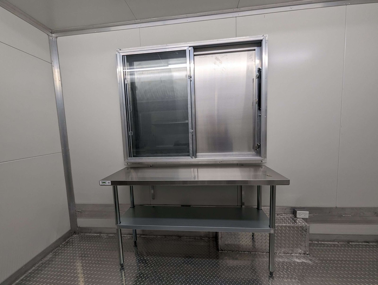 1 window 60inx48in, with two sliding glasses and screen, with 60″x18″ stainless steel work table with undershelf