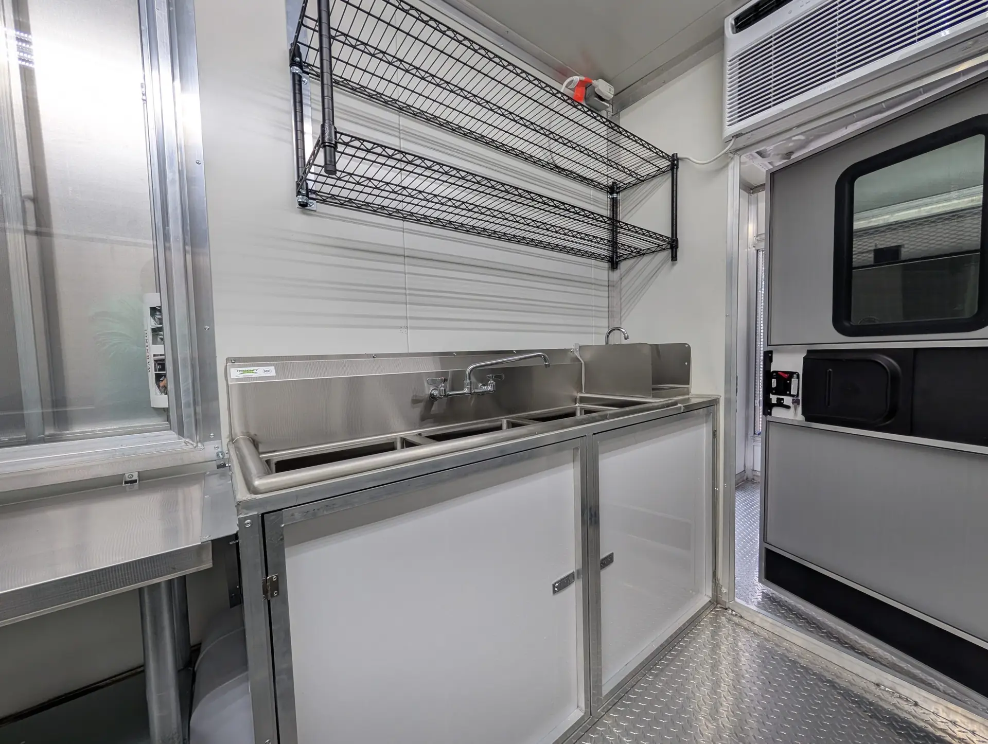 1 window 60inx48in, with two sliding glasses and screen, with 60″x18″ stainless steel work table with undershelf